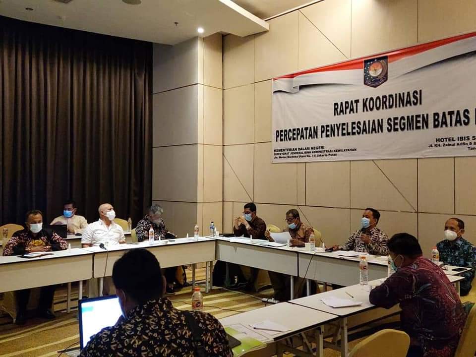 Rakor percepatan penyelesaian Tapal Batas Daerah yang diselenggarakan Direktorat Jenderal Bina Administrasi Kewilayahan Kementerian Dalam Negeri, bertempat di Aula Hotel Ibis Styles Jakarta, Selasa (22/06/2021).