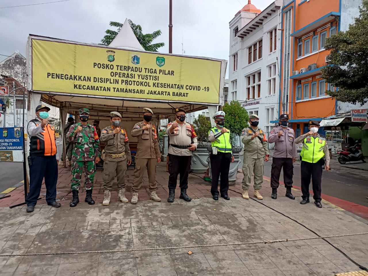 Kegiatan diawali dengan apel dipimpin Kanit Sabhara Polsek Tamansari AKP Sugiran dihadiri Polantas Aiptu Supriyanto, Pol PP Kecamatan Tamansari E.Prianda (Danru PP Kec. Tamansari ), Dishub Kecamatan Timin (Danru) bertempat di Posko terpadu Tiga Pilar operasi yustisi Covid-19 Jl.Kunir RW 06 Kelurahan Pinangsia Kecamatan Tamansari Jakarta Barat.Kamis (1/7)