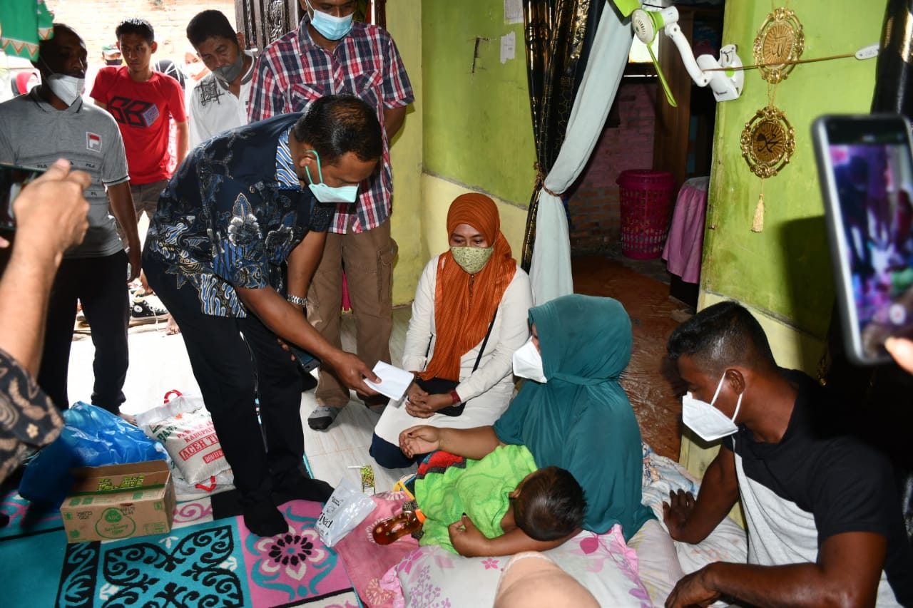 KeizalinNews Aceh Timur — Bupati Aceh Timur H. Hasballah Bin H.M. Thaib, SH mengunjungi Hafizal Khadafi (4), Balita yang mengalami penyakit Talasemia di Dusun Kesehatan, Desa Tanoh Anou, Kecamatan Idi Rayeuk, Aceh Timur. Jumat (9/7/2021).
