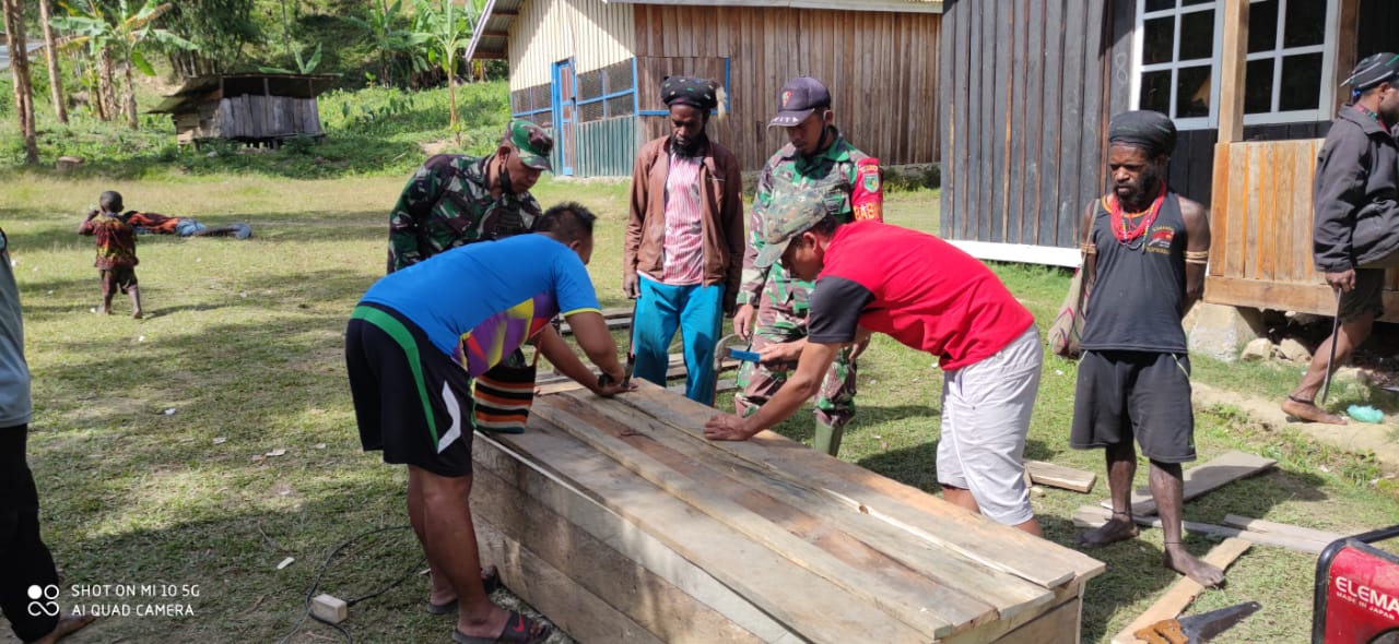 KeizalinNews.Com Tingginambut — Dalam mewujudkan terjalinnya kebersamaan antara masyarakat dan Banbinsa Posramil Tingginambut di desa binaan, dalam hal ini Sertu Fitriyanto dan Serda Abubakar melaksanakan pembuatan peti mayat ada salah satu warga kampung tingginambut yang meninggal karena sakit di Distrik Tingginambut (Sabtu 17 juli 2021).