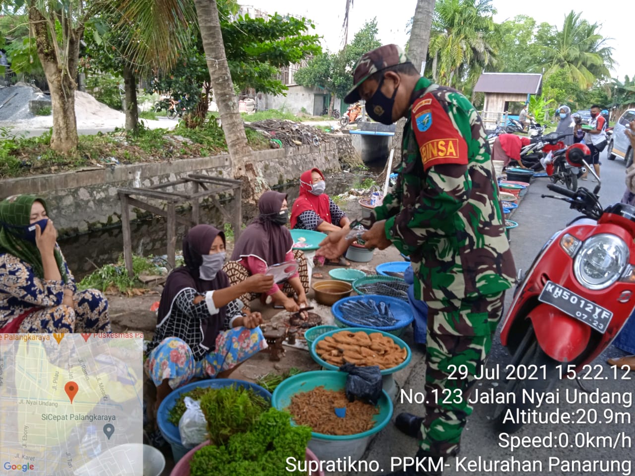 Palangka raya KEIZALINNEWS – Babinsa Koramil 1016-01/Pahandut Serma Saulus Hasibuan bersama Lurah dan Tim PPKM Kelurahan Panarung melakukan pemantauan bagi para pedagang pasar dadakan di jalan Damang Batu, Kelurahan Panarung, Palangka Raya, Kamis (29/7/21).