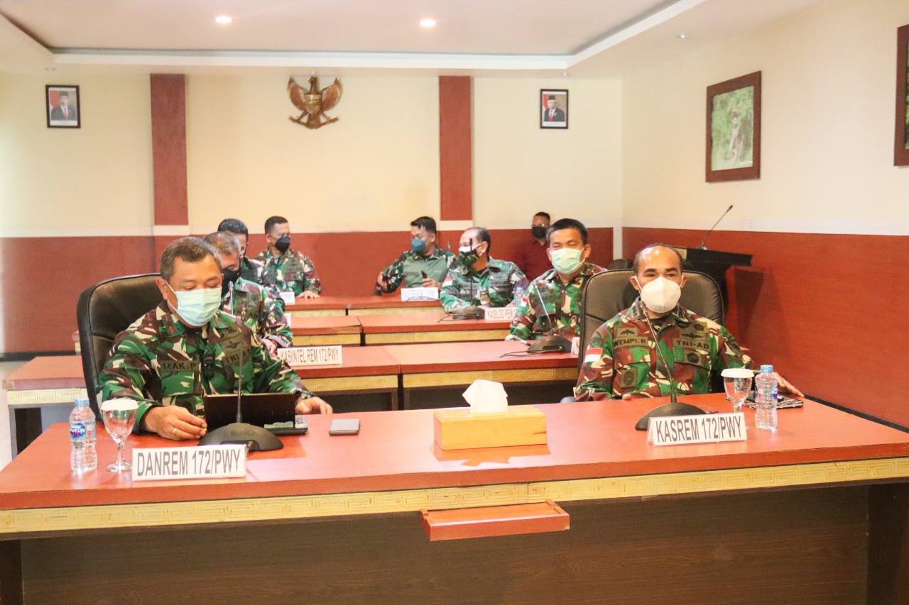 Jayapura KEIZALINNEWS – Komandan Korem 172/PWY Brigjen TNI Izak Pangemanan didampingi Kepala Staf Korem 172/PWY Kolonel Inf Wempi Ramandei beserta Para Kasi Korem 172/PWY mengikuti Rapat Koordinasi Persiapan Pelaksanaan Putusan MK No. 145/PHP.BUP-XIX/2021 terkait Pemungutan Suara Ulang (PSU) di Kabupaten Yalimo yang diselenggarakan oleh KPU Provinsi Papua secara Virtual, bertempat di Makorem 172/PWY, Jumat (6/8)
