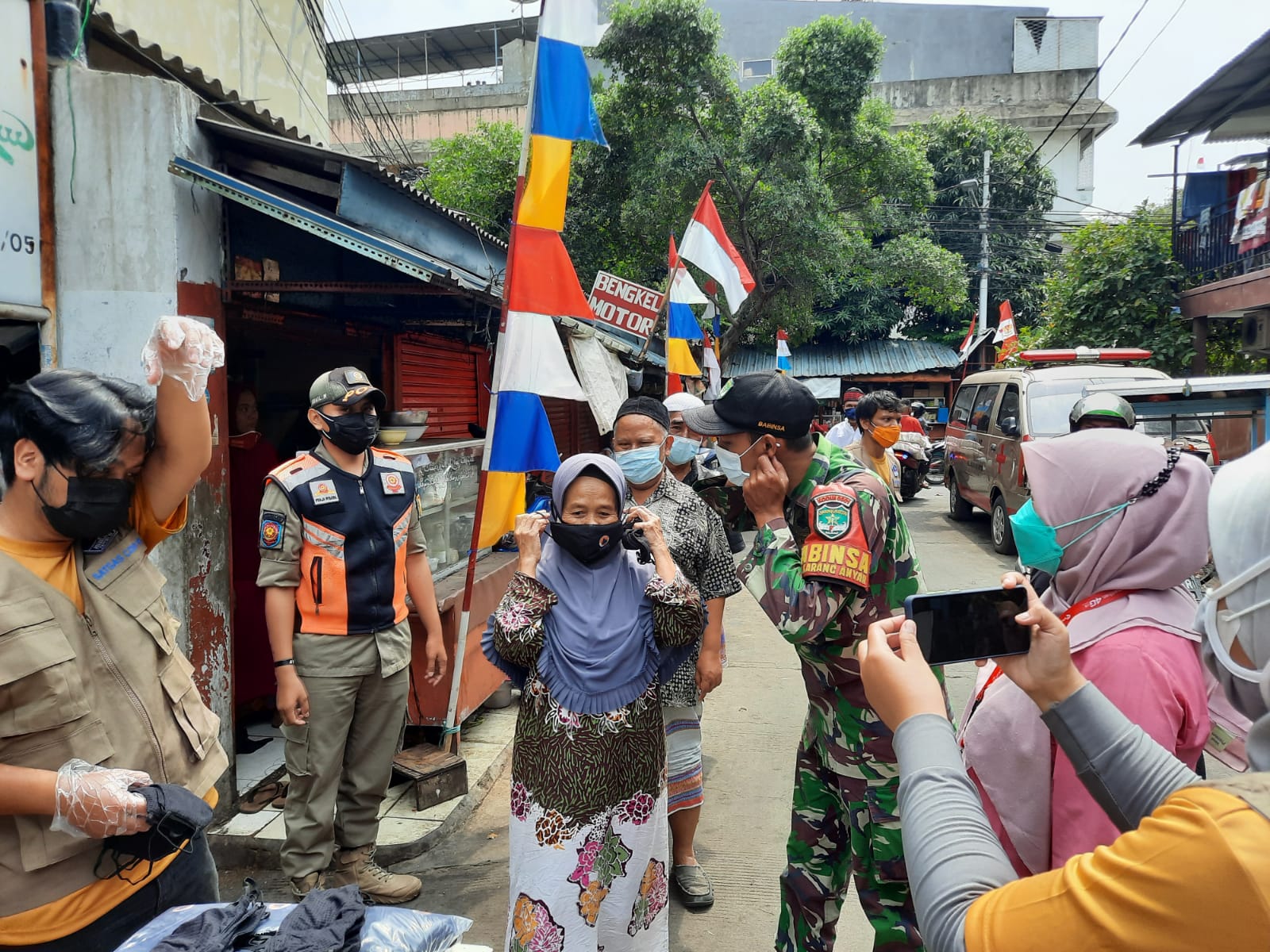 KeizalinNews.com Sawah Besar — Babinsa Serda Faisal anggota Koramil 02/Sawah Besar melaksanakan monitoring pembagian masker dari BNPB, di Masjid Nulur Islam Jln. B3 RT 03/RW 06, kelurahan Karang Anyar, kecamatan Sawah Besar, Jakarta Pusat, Jumat (13/8/2021).