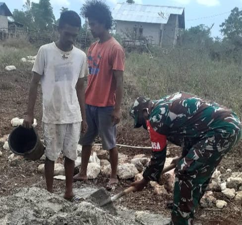 MBD, Maluku, Keizalinnews.Com,- Guna mewujudkan serta merajut kebersamaan bersama warga binaan lewat kegiatan bakti sosial. Kopda Irfan Tuanaya Bintara pembina desa (Babinsa) Koramil 1511-01/ Taikur gotong royong bersama warganya membantu membangun pondasi rumah milik Leo Saiklela warga desa Keti Letpai kecamatan Pulau Lakor kabupaten Maluku Barat Daya, Maluku. Rabu 01 September 2021.