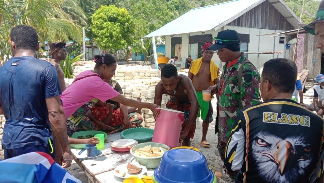 Kembali ditambahkannya, “Dengan kedatangan salah seorang warga yang rela menyiapkan makanan santap siang bagi kami, kami sangat terharu dan ini merupakan penghargaan yang sangat besar dari warga bagi kami para personel TNI yang ada ditempat ini, sebab itu kami mengucapkan terima kasih sebesar-besarnya terhadap dukungan dari seluruh lapisan warga miosnum, terkhususnya kepada Ibu Rosita Rumbewas yang hari ini telah menyiapkan makanan santap siang yang enak dan sangat nikmat ini”, pungkasnya.