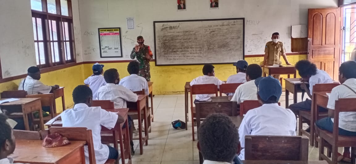 KeizalinNews.com Enarotali — Babinsa Koramil 1703-01/Enarotali sertu Vepriasen Ton mengisi kegiatan belajar mengajar dengan materi Wawasan Kebangsaan bertempat di SMP YPPGI Enarotali,Jln.Poros Madi-Enarotali, Kampung Bapouda,Distrik Paniai timur. Selasa (14/09/2021).