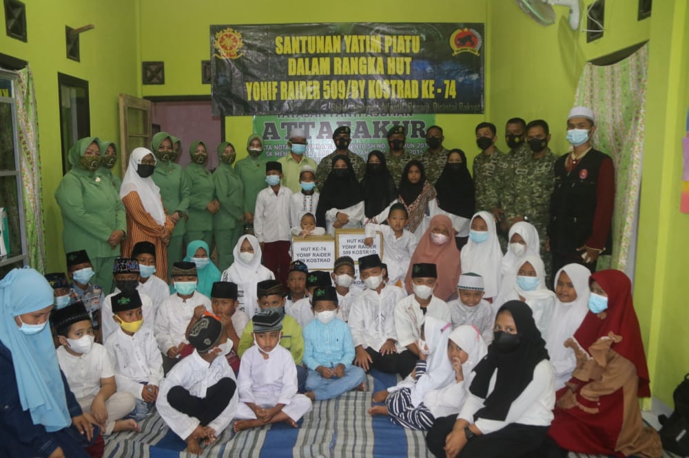 Dalam kegiatan tersebut, Komandan Yonif Raider 509 Kostrad Letkol Syafrinaldi, S.E. beserta rombongan menyerahkan bantuan berupa kebutuhan pokok kepada anak yatim dan Pengurus Panti Asuhan.