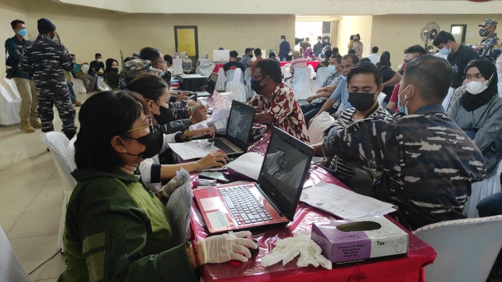 KeizalinNews.com Asahan — TNI Angkatan Laut Lanal Tanjung Balai Asahan bekerja sama dengan instansi TNI-Polri serta Pemerintah Kabupaten (Pemkab) Asahan, Provinsi Sumatera Utara melaksanakan serbuan vaksinasi di GOR Asahan, Jumat (17/9/2021).