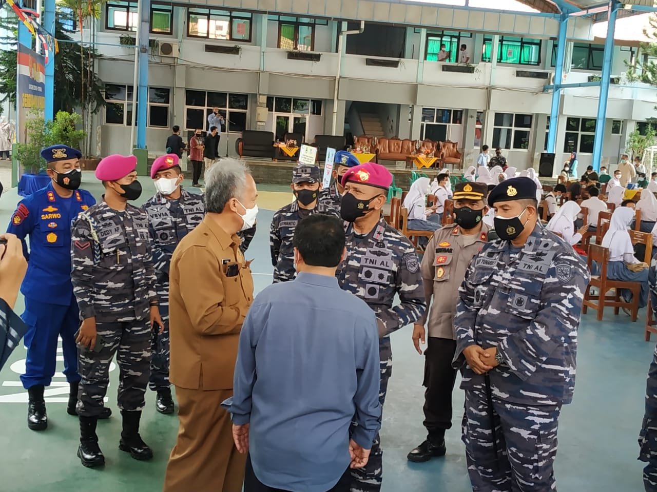 KeizalinNews.com Cirebon — Pangkalan TNI AL Cirebon bekerjasama dengan Pemkot Kota Cirebon menyasar pelajar kota Cirebon menuju vaksinasi nasional Covid-19 yang dihadiri dan ditinjau langsung oleh Komandan Lantamal III Jakarta Brigjen TNI (Mar) Umar Farouq, S.A.P. di SMAN 1 kota Cirebon, Selasa (21/09/2021).