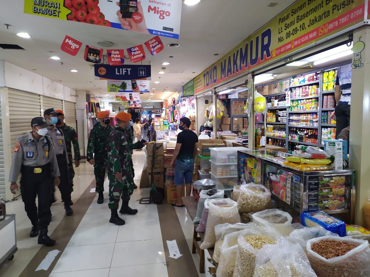 KeizalinNews.com Jakarta Pusat —Pasukan BKO Kodim 0501/JP BS dari Paskhas Yon 461 yang dipimpin Serda Daniel, didampingi Babinsa Koramil 03/Senen Serda Herianto melaksanakan pengawasan protokol kesehatan, di PD Pasar Jaya Senen Blok 3, Senen, Jakarta Pusat, Sabtu (25/9/2021).