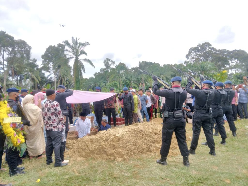 Upacara yang dipimpin oleh Wadansat Brimob Polda Aceh AKBP Dr. Beridiansyah S.H., M.H., diiringi dengan tembakan salvo, yang merupakan tembakan serentak sebagai tanda penghormatan terakhir yang diberikan kepada prajurit yang gugur dalam melaksanakan tugas.
