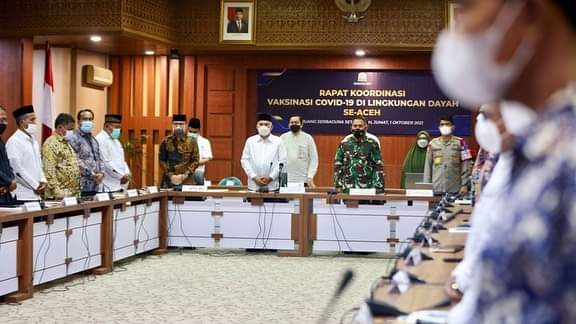 Keizalinnews.com|Redelong- Kegiatan langsung dipimpin oleh Sekda Aceh dr. Taqwallah, M.Kes beserta Forkopimda Aceh serta turut dihadiri oleh seluruh Sekda Kab/Kota se-Aceh dan didampingi oleh Kepala Dinas Kesehatan, Kepala Dinas Pendidikan dan Kepala Dinas Pendidikan Dayah masing-masing Kab/Kota serta turut diikuti oleh para Kepala Puskesmas secara virtual dari lokasi masing-masing.