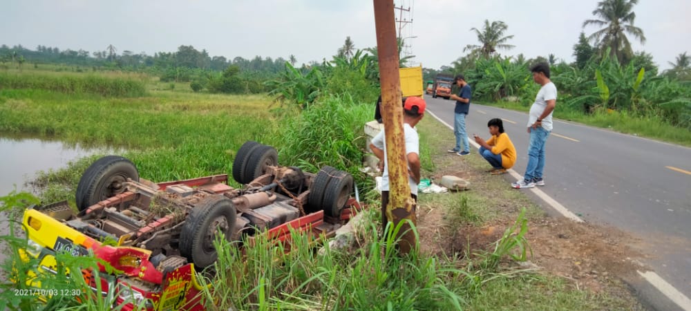 KeizalinNews.Com– Kabupaten Oki| Truk membawa buah sawit bernomor polisi BG 8840 KI yang di kendarai Adi (19) dari suryadi menuju PT Kelantan, terjuguling usai menyeruduk tiang listrik di jalan lintas timur Desa Banding Anyar kecamatan kayuagung Kabupaten Ogan Komering Ilir (OKI). Minggu, sekitar pukul 10.30 WIB, minggu (03/10/2021).
