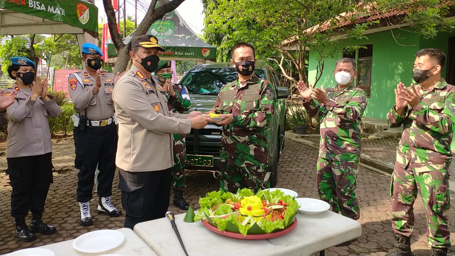 Kapolres bersama jajaran mengucapkan dirgahayu kepada TNI melalui Dandim 0507/Bekasi. Pemotongan tumpeng dan penyerahan potongan tumpeng dari Kapolres kepada Dandim menambah hangat suasana.