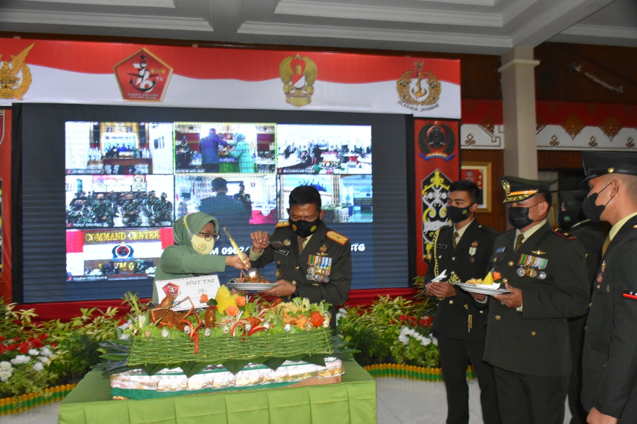 Danrem 091/ASN didampingi istri yang juga Ketua Persit Kartika Chandra Kirana Koorcab Rem 091 PD VI/Mulawarman melanjutkan dengan menyerahkan potongan tumpeng dan mengucapkan selamat pada prajurit termuda dan prajurit usia senior atau tua mengabdi. (Hera)