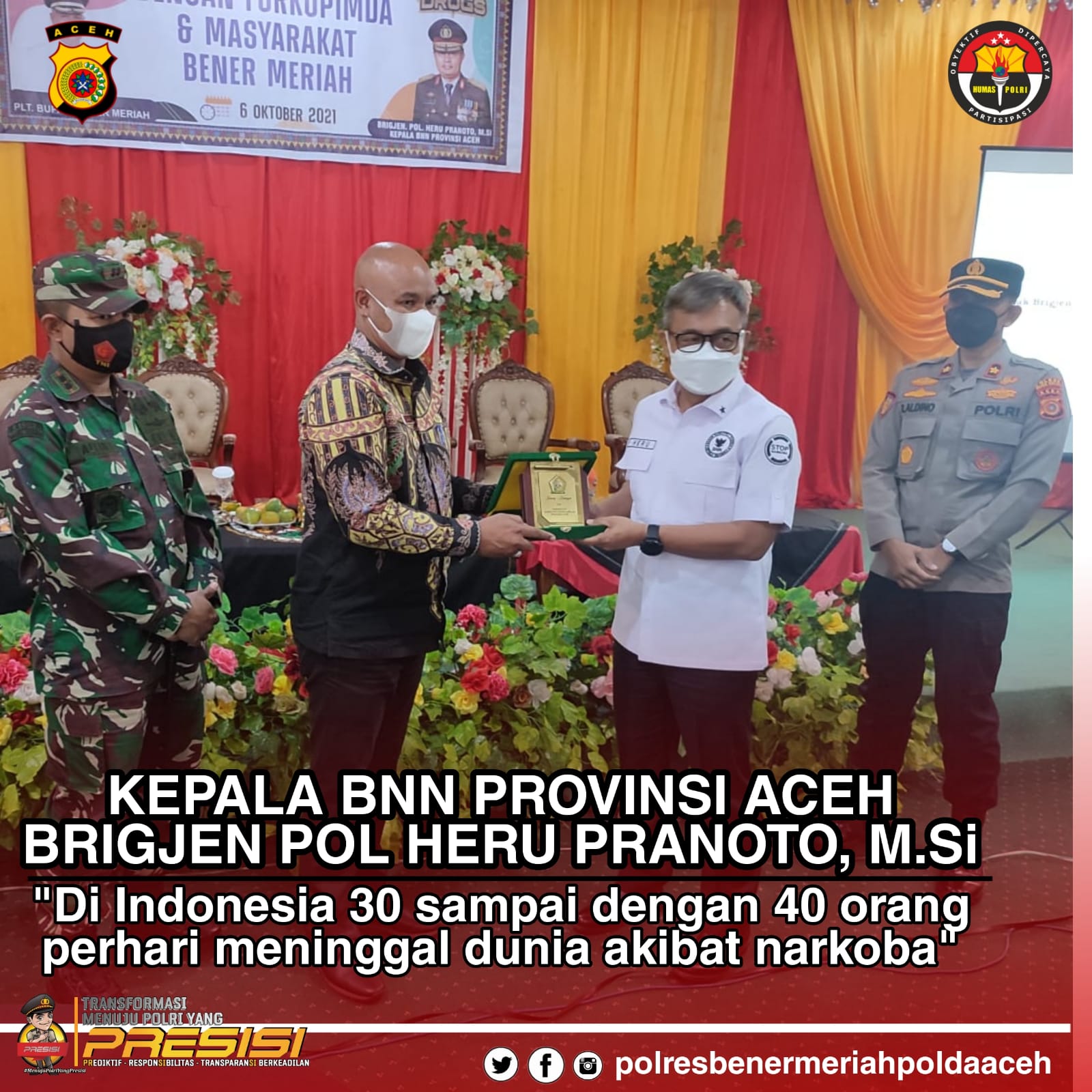 Dalam sambutannya Kepala BNNP Aceh, menyampaikan, “sebagai tindak lanjut perintah bapak Presiden bahwa Indonesia darurat narkoba maka perlu ditindak lanjuti sebagai upaya untuk menekan peredaran gelap Narkotika khususnya yang ada di wilayah Kabupaten Bener Meriah”