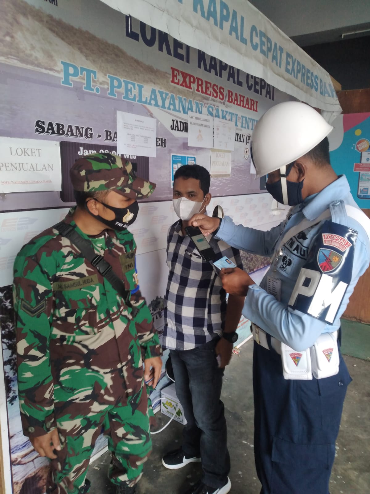 Selamat siang mohon maaf, kami petugas TNI-POLRI beserta instansi yang lain, melaksanakan perintah dari pimpinan sesuai dengan aturan Walikota Sabang akan memeriksa persyaratan, maaf bisa tunjukkan kartu vaksin, Ucap personel Babinpotdirga kepada salah satu penumpang.