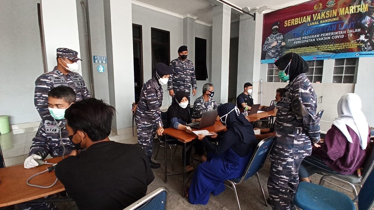 KeizalinNews.com Bandung — TNI Angkatan Laut dalam hal ini Lanal Bandung gelar terus serbuan vaksinasi Nasional kepada masyarakat Bandung yang diadakan di Mako Lanal Bandung, Jalan Aria Jipang No.8 Bandung, Kamis(14/10/2021).