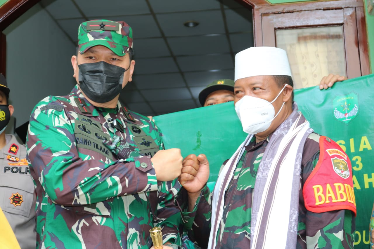 Pimpinan Yayasan Fajar Qolbi Serma Iswandi (Anggota Koramil 04 Ciledug) menerima sumbangan dari Danrem dengan rasa syukur dan senang hati.
