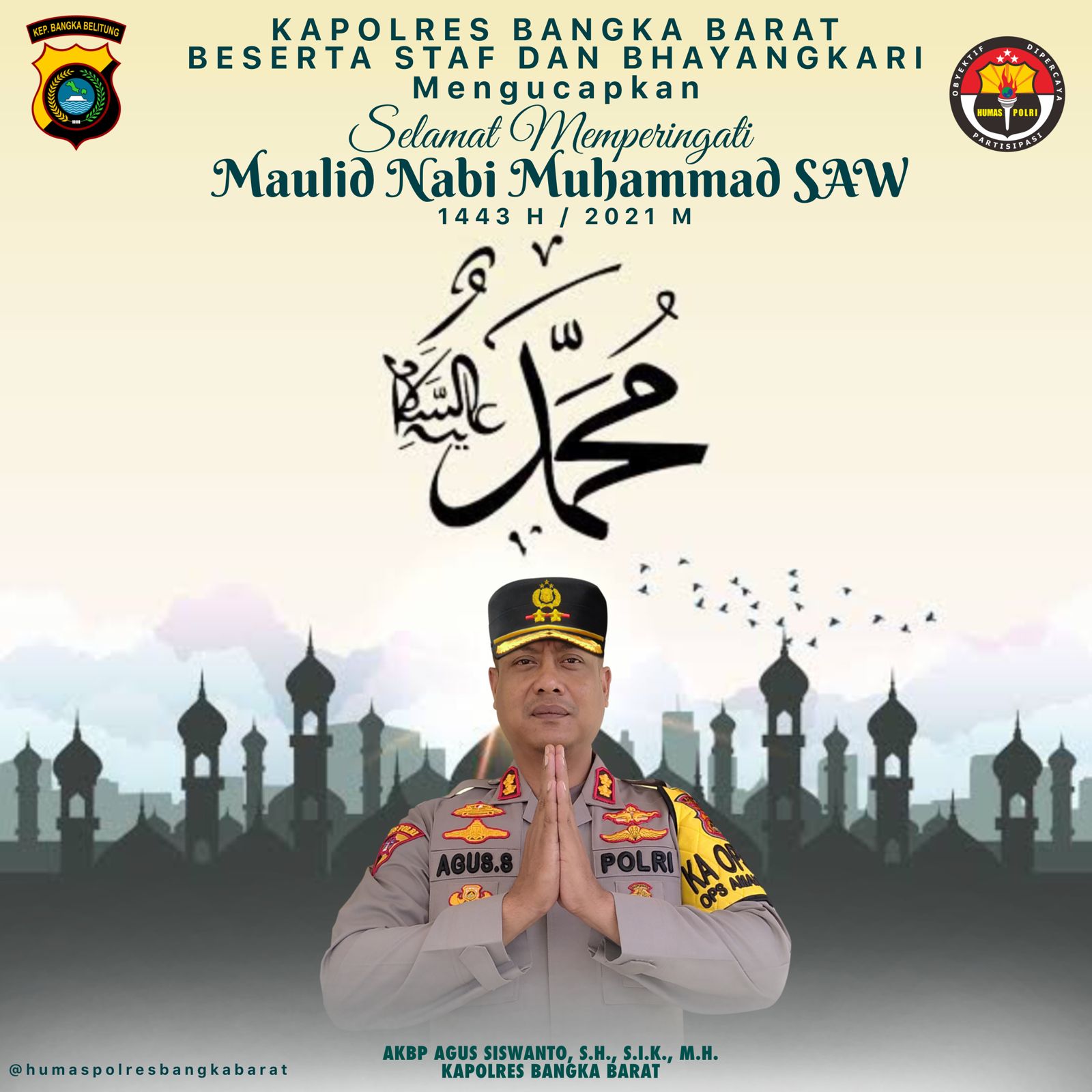 KeizalinNews.Com -Kapolres Bangka Barat AKBP Agus Siswanto S.H., S.I.K., M.H beserta staf dan Bhayangkari mengucapkan selamat memperingati Maulud Nabi Muhammad SAW 1443 Hijriyah /2021 M melalui akun medsos Polres Bangka Barat, Selasa (19/10/2021).
