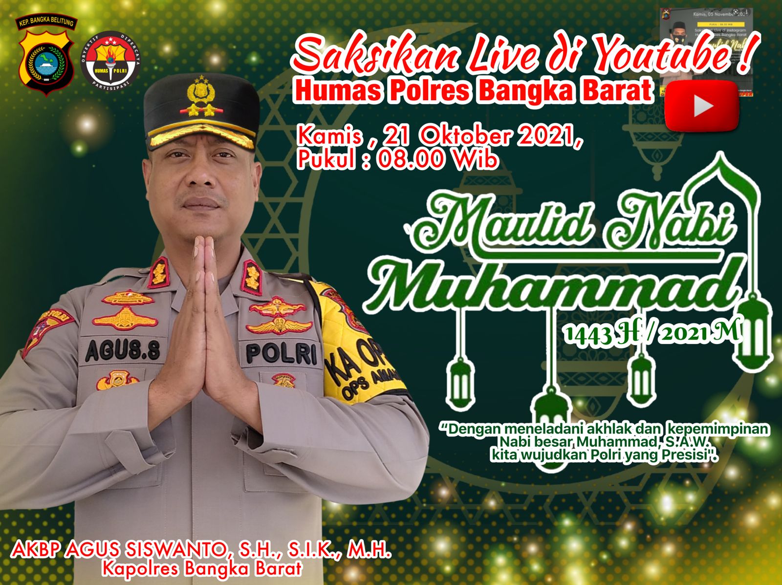 KeizalinNews.Com -polres Bangka Barat akan melaksanakan peringatan maulid tv Nabi yang akan diselenggarakan pada hari kamis 21 Oktober 2021 di Saksikan Live di youtube Humas Polres Bangka Barat. Rabu 20 Oktober 2021