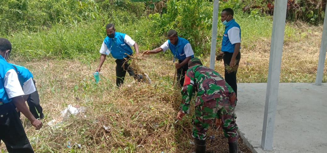 Setelah selesai memberikan pemahaman tentang dampak positif tentang vaksinasi Sertu Yauji mengajak para Siswa yang sedang PKL (Praktek Kerja Lapangan) untuk membersihkan Sampah yang ada disekitar Kantor Kampung Waharia. (Hera)