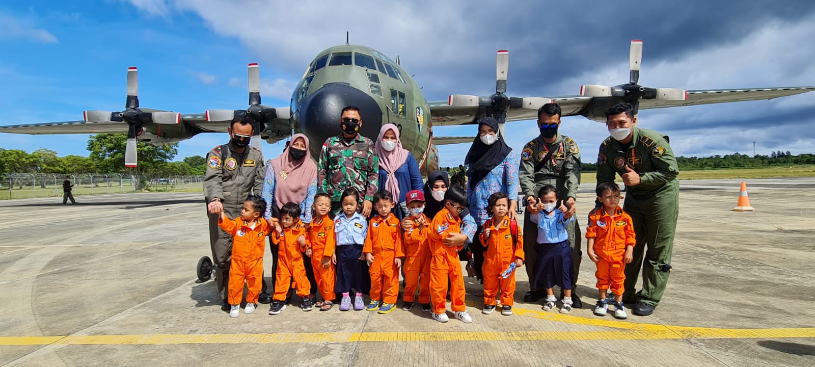 KeizalinNews Aceh timur TNI AU. Apron Lanud Maimun Saleh di kunjungi oleh generasi penerus bangsa Indonesia dari Paud Angkasa, dengan berseragam warna orange didampingi oleh para guru Paud Angkasa Lanud Maimun Saleh, Senin (25/10/2021).