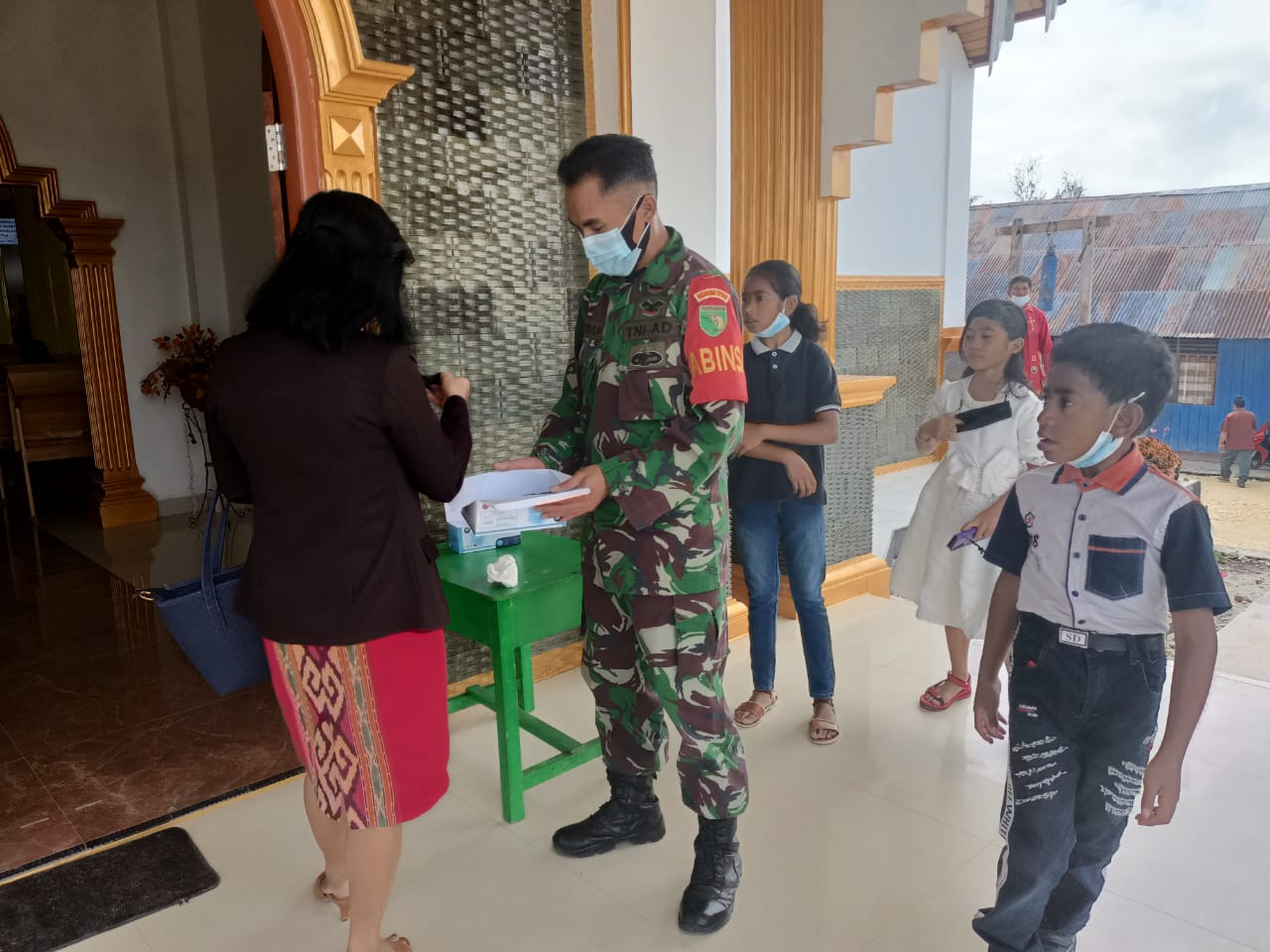 KeizalinNews.com Tigi — Guna mencegah penularan virus Corona dimana pandemi virus blm berakhir sampai saat ini Babinsa Koramil 02/Tigi Kodim 1703/Deiyai Sertu Natalis Paborong melaksanakan Cipta kondisi dengan membagikan masker kepada Jemaat Gereja GKI Yudea,jalan kartini, Desa Waghete, Distrik Tigi, Kabupaten Deiyai, Minggu ( 31/10/2021 ).