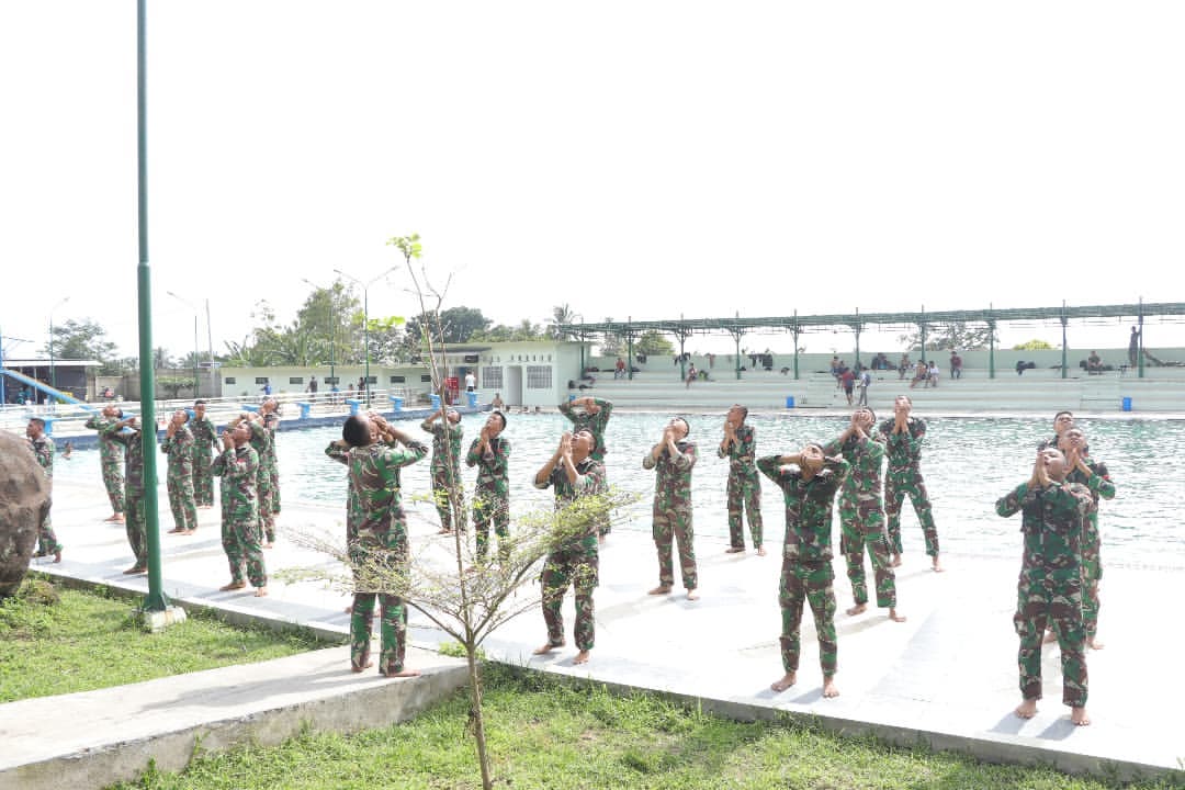 Sebelum renang dimulai, kegiatan diawali dengan pengecekan kesehatan dilanjut dengan senam pemanasan yang dipimpin oleh Sertu Susilo selaku Bajas. “Pemanasan ini dilaksanakan untuk meminimalisir cidera saat berenang,” ujarnya.