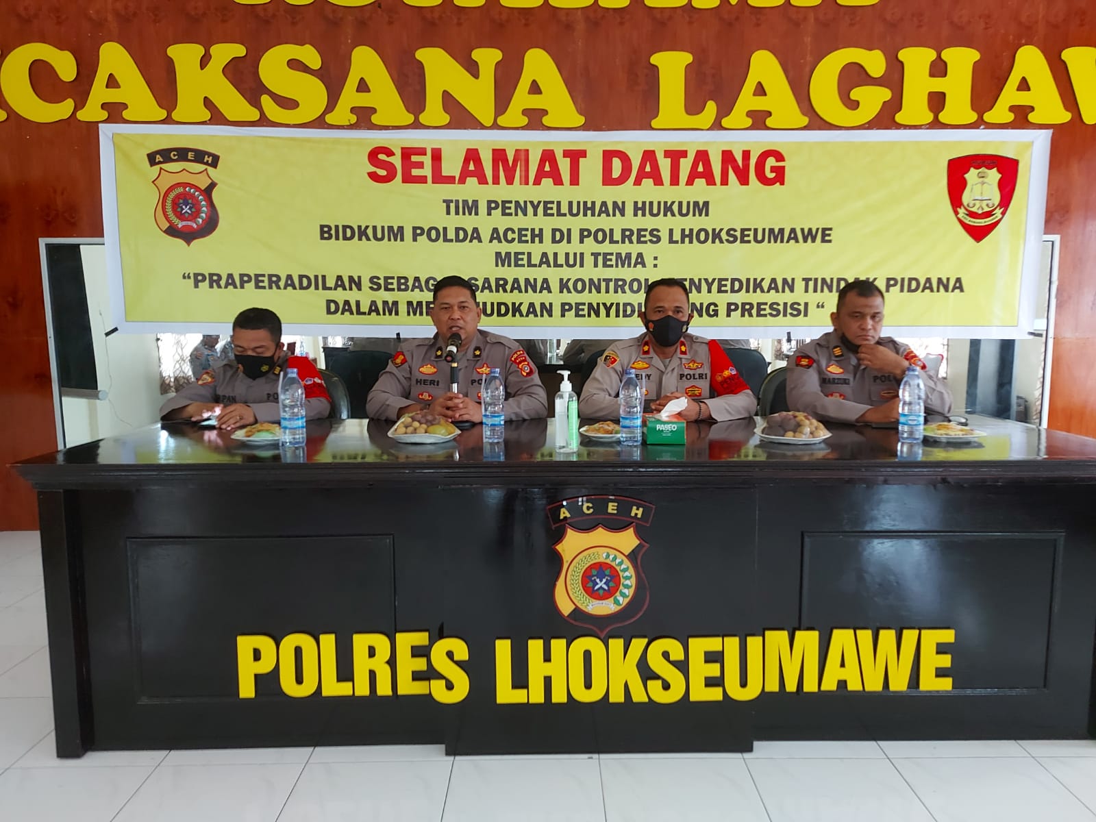 KeizalinNews LHOKSEUMAWE- Penyidik Polres Lhokseumawe dibekali penyuluhan hukum dari Bidkum Polda Aceh dengan tema Praperadilan sebagai sarana kontrol penyidikan tindak pidana dalam mewujudkan penyidik yang presisi yang berlangsung di Aula Rupatama Laghawa Polres Lhokseumawe, rabu (3/11/2021) pagi.