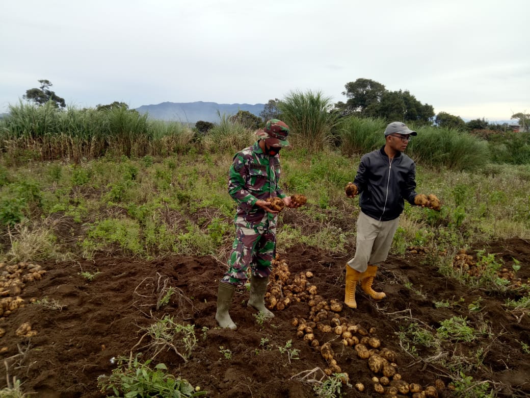 Keizalinnews.com|Redelong – Serda Sumanto Babinsa Pos Bener Kelipah Koramil 05/Permata bersama warga dan aparatur desa memanen kentang varietas Granola 2 di Desa Suku Bener Kecamatan Bener Kelipah Kabupaten Bener Meriah15 Ton kentang Hasil Ketahanan Pangan Babinsa dan Masyarakat, Selasa 16/11/2021.