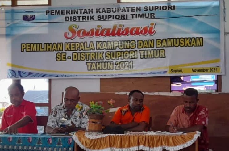 KeizalinNews.com  Supiori — Babinsa Koramil 1708-06/SU Serda Ali Ramli Bugis bersama Babinkantikmas menghadiri sosialisasi pemilihan kepala kampung dan Bamuskam di Desa Syurdori Distrik Supiori Timur, Sabtu (20/11/2021).