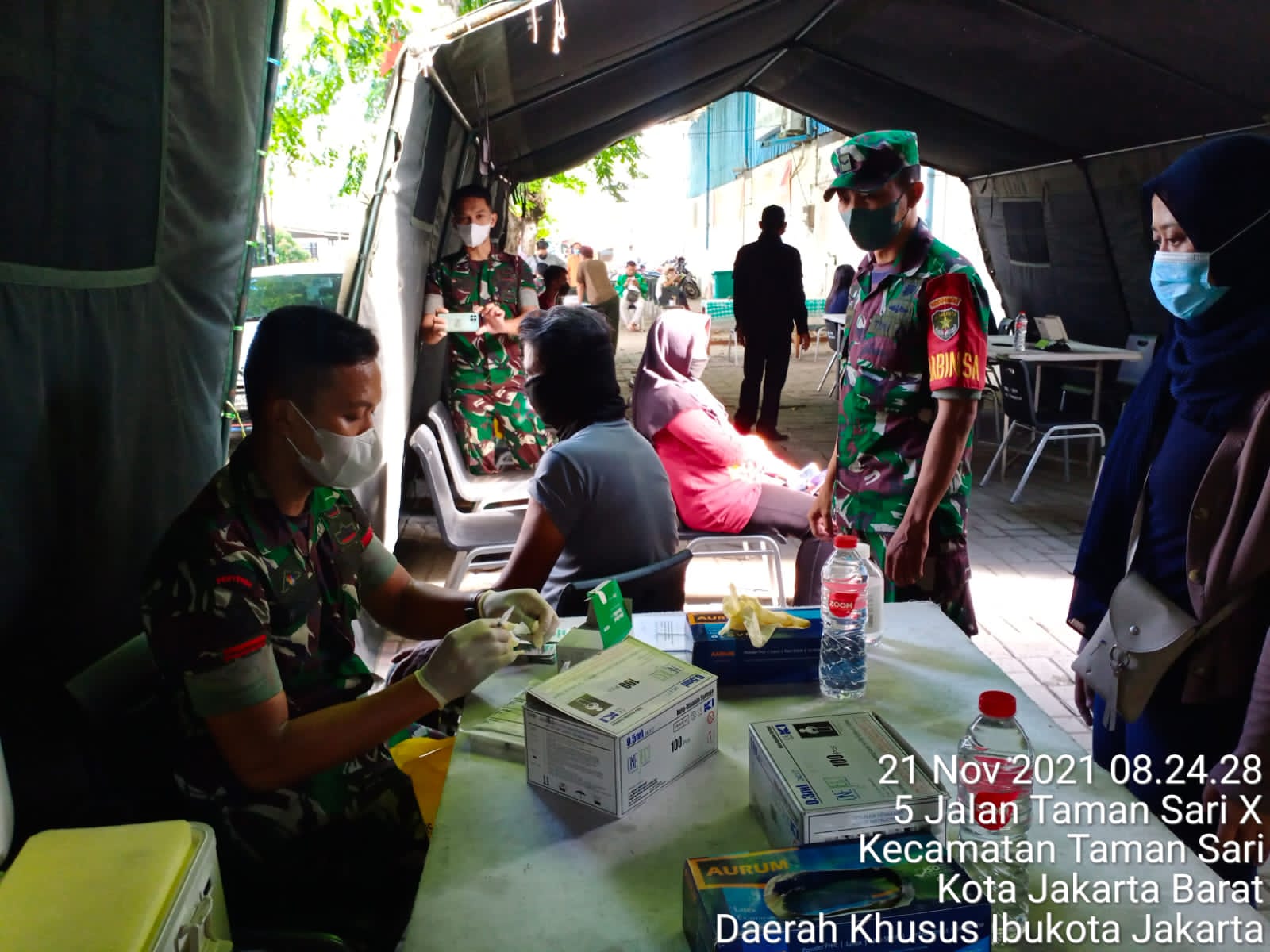 Danramil Tamansari , Mayor Inf Zulkarnaen Galib selaku penanggung jawab kegiatan serbuan vaksin menjelaskan, dalam percepatan penanganan covid-19 demi mendukung program pemerintah Nakes BKO Yonkav 9/SDK terus eksis melayani warga masyarakat DKI Jakarta meskipun hari libur.