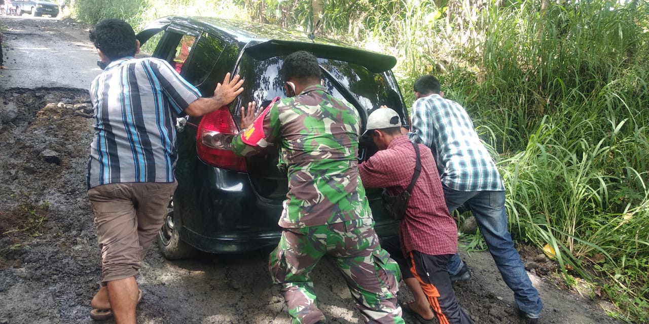 Terlihat Seperti yang dilakukan oleh Babinsa Koramil 03/TG Kodim 0119/BM Sertu Roby membantu mendorong mobil pribadi yang tidak kuat, saat melintasi tanjakan