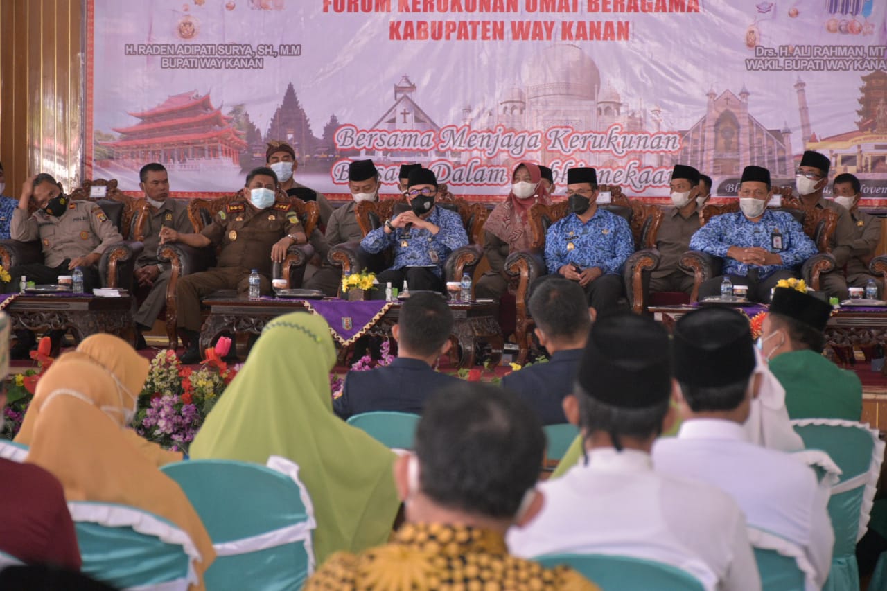 Dalam sambutannya Bupati,” Masyarakat Way Kanan yang majemuk terdiri dari berbagai suku, ras, agama dan adat istiadat yang merupakan kekayaan bangsa yang sangat berharga serta menjadi kebanggaan kita serta memberikan manfaat yang sebesar dalam pembangunan, namun sebaliknya kemajemukan ini dapat menimbulkan kemudhorotan bahkan akan menimbulkan konflik Sosial yang mengancam perpecahan, dan yang perlu kita lakukan untuk mencegah konflik adalah dengan membangun kesadaran untuk selalu memiliki sikap waspada serta menjaga toleransi dan saling menghargai antara pemeluk agama serta menjunjun tinggi persatuan sebagai satu bangsa dan se – tanah air,JelasBupati.