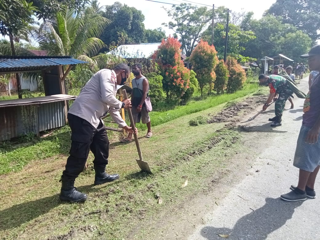 KeizalinNews.com Waropen — Dalam menyongsong Natal di tahun ini Babinsa Serda Zainal Saparang, Bhabinkamtibmas, Kepala kampung dan Aparat kampung di bantu beberapa masyarakat melaksanakan kegiatan karya bakti pembersihan bahu jalan di Kampung Urfas 3, Distrik Urei Faisei, Kab. Waropen, Selasa, 07/12/2021.