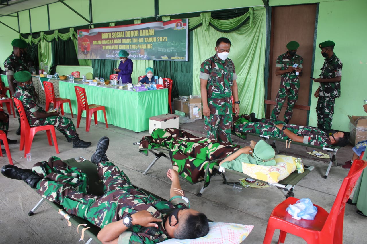 KeizalinNews.com Nabire — Dalam rangka Hari Juang TNI AD Tahun 2021, Kodim 1705/Nabire menggandeng Polkes Nabire dan Unit transfusi darah RSUD Nabire. Mengadakan Bakti Sosial Donor Darah bertempat di halaman Aula Kodim 1705/Nabire.