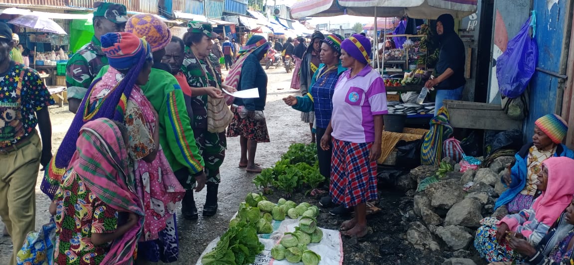 KeizalinNews.com Enarotali — Menjelang perayaan Natal tahun 2021 dan tahun baru 2022, Koramil 1703-01/Enarotali di pimpin langsung Oleh Danramil 1703-01/Enarotali Mayor Cba (k) Marina Rumawak bersama Wadanramil Letda Inf Alpius Gobai melakukan Komunikasi sosial (Komsos) bersama mama-mama pedagang yang berada di pasar Enarotali Distrik Paniai timur, Kabupaten Paniai untuk mengecek harga dan stok bahan makananan menjelang Natal dan tahun baru. Selasa (14/12/2021).