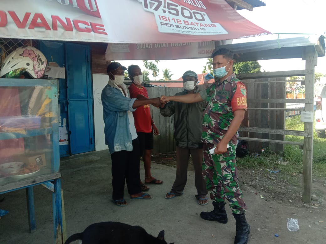 “Masih ada beberapa warga masyarakat yang enggan menggunakan masker, itu tegas saya untuk memberi pengertian dengan sabar disertai aksi pembagian masker di lapangan,” ucap Sertu Yauji. (Hera)