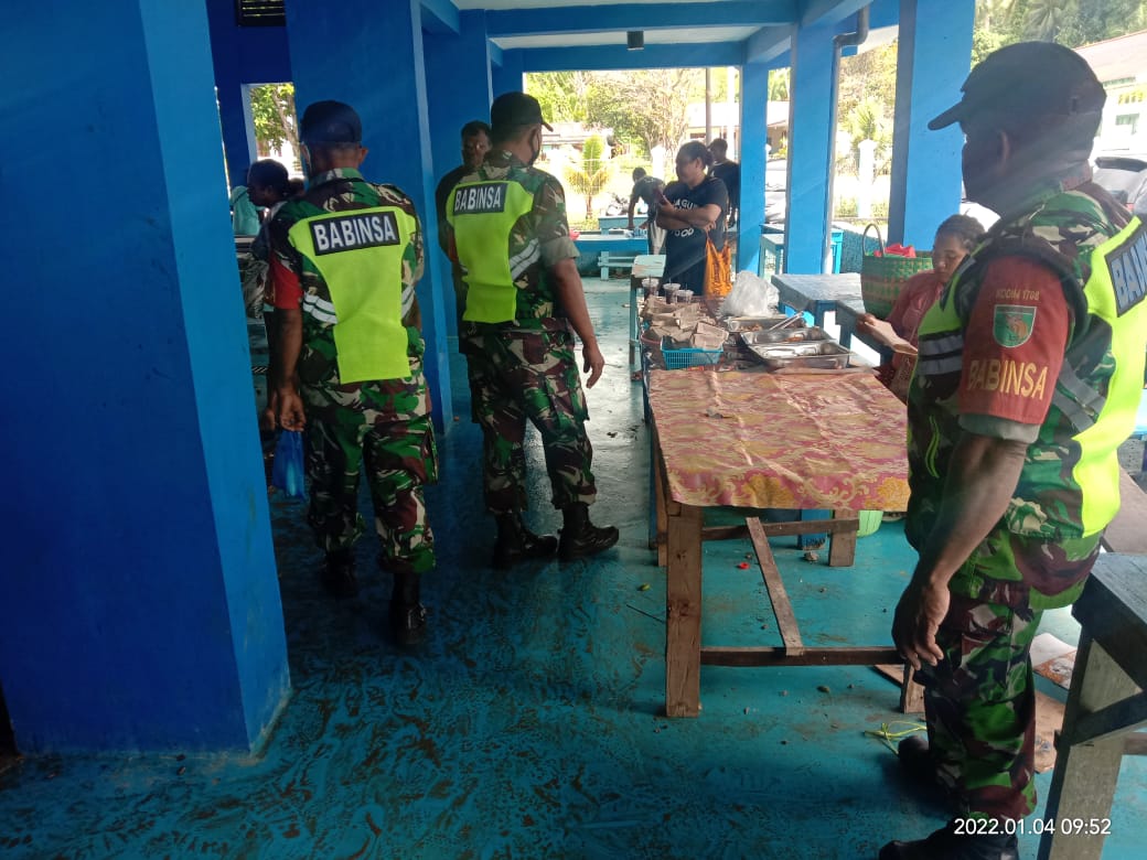 KeizalinNews.com Biak Timur — Babinsa Posramil 1708-01/Biak Timur Sertu Petrus Ikanubun bersama dua orang anggota yakni Sertu Sombuk dan Sertu Reynold A. J Rumpaisum melaksanakan kegiatan Komunikasi Sosial (Komsos) dengan warga dan para pedagang ikan di Pasar Bosnik, Distrik Biak Timur, Kabupaten Biak Numfor, Rabu (05/01/2022).