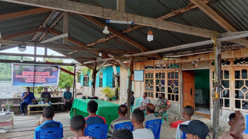 KeizalinNews.com Yapen — Dalam rangka mendukung percepatan pembangunan wilayah binaannya dan meningkatkan kesejahteraan warga binaannya, berlokasi dibalai Kampung Mambawi Distrik Kepulauan Ambai Kab. Kepulauan Yapen, Sertu Semuel Yowey Babinsa Koramil 1709-01/Yapen Selatan Kodim 1709/Yawa turut mengambil bagian dalam Kegiatan Musrenbang (Musyawarah Perencanaan Pembangunan) Kampung Mambawi Tahun Anggaran 2022, Rabu (12/01/2022).