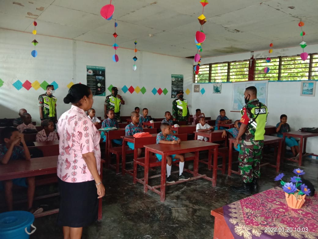 KeizalinNews.com Biak Timur — Untuk menanamkan rasa cinta tanah air kepada anak- anak pelajar sejak usia dini, Babinsa Posramil 1708-01/Biak Timur Sertu Reynold A. J Rumpaisum dan tiga orang anggota yakni Sertu Ikanubun, Sertu Ferdison serta Koptu Silaka memberikan materi Wawasan Kebangsaan (Wasbang) kepada siswa dan siswi pelajar SD YPK Karmel Bosnik, Distrik Biak Timur, Kabupaten Biak Numfor, Jum’at (21/01/2022).