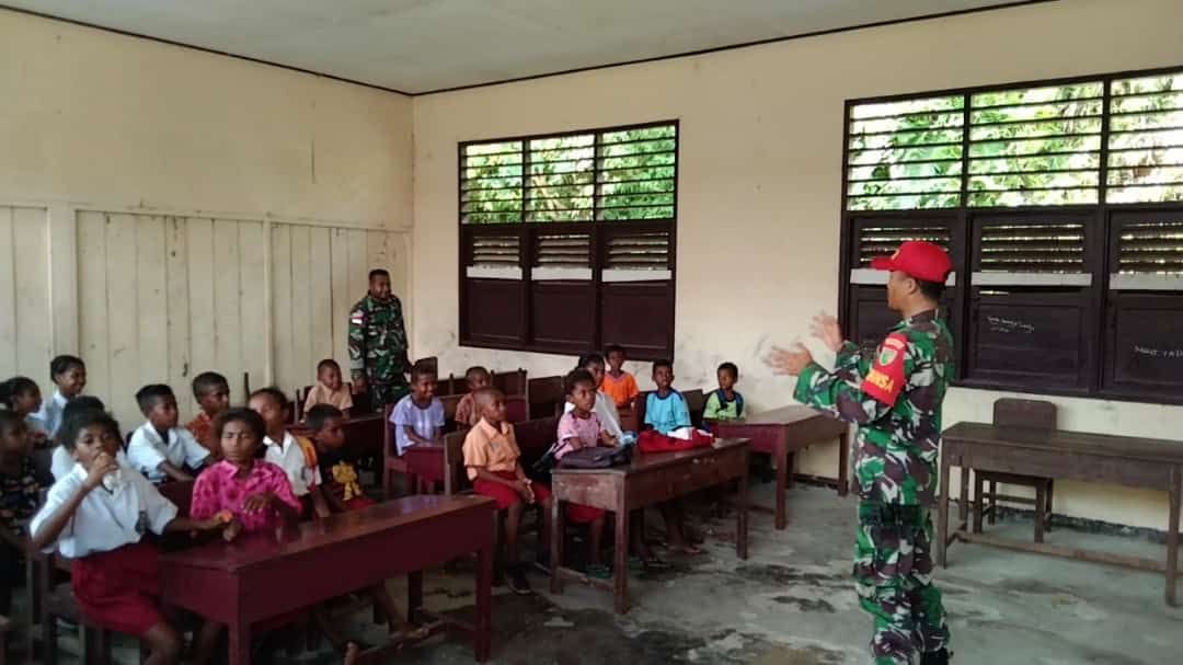 Kedatangan 2 orang Babinsa Yapbar ini, disambut dengan sapaan selamat pagi secara kompak dan tepuk tangan serta senyum gembira oleh seluruh siswa yang ada didalam ruangan kelas tersebut.
