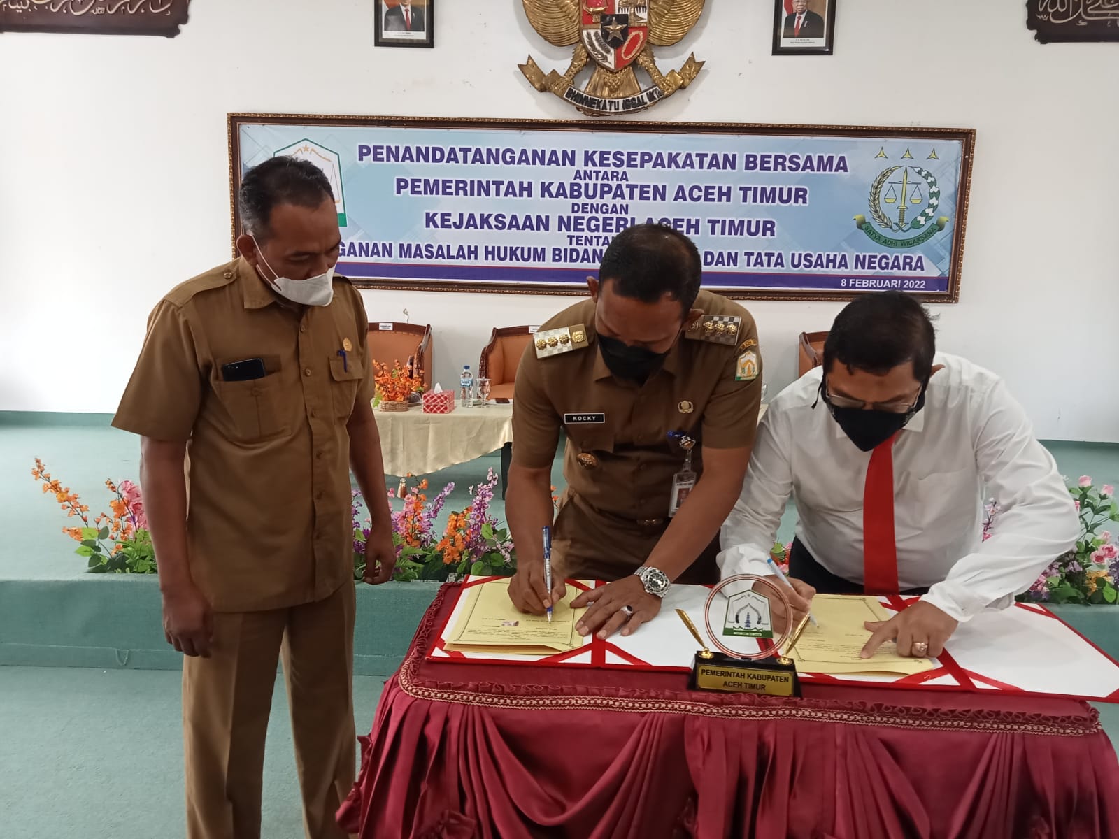 KeizalinNews Aceh Timur – Bupati Aceh Timur, H. Hasballah Bin HM Thaib, SH melakukan penandatanganan kesepakatan bersama antara Pemerintah Kabupaten Aceh Timur dengan Kejaksaan Negeri Aceh Timur tentang penanganan Masalah Hukum Bidang Perdata dan Tata Usaha Negara, di aula gedung serbaguna Pemkab Aceh Timur, Selasa (8/2).