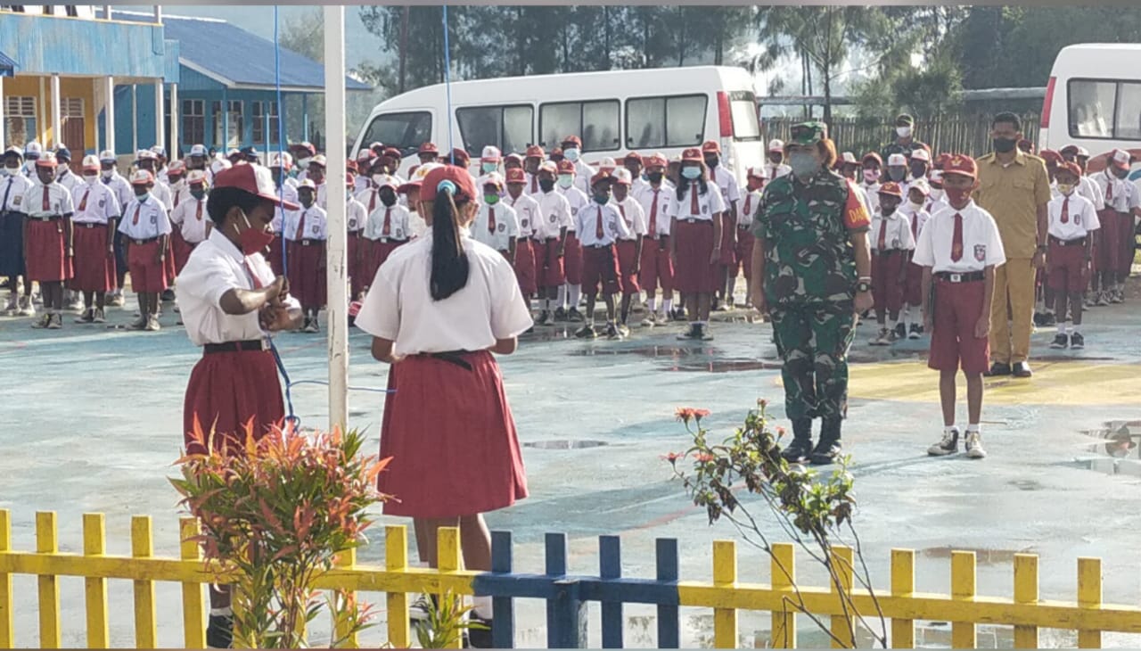 KeizalinNews.com Enarotali — Danramil 1703-01/Enarotali Mayor Cba (k) Marina Rumawak bertindak sebagai Inspektur Upacara Bendera di Sekolah Dasar YPPGI Kepas Kopo, Distrik Paniai timur Kabupaten Paniai dengan peserta upacara berjumlah 185 orang siswa-siswi SD dan SMP. Senin (14/02/2022)