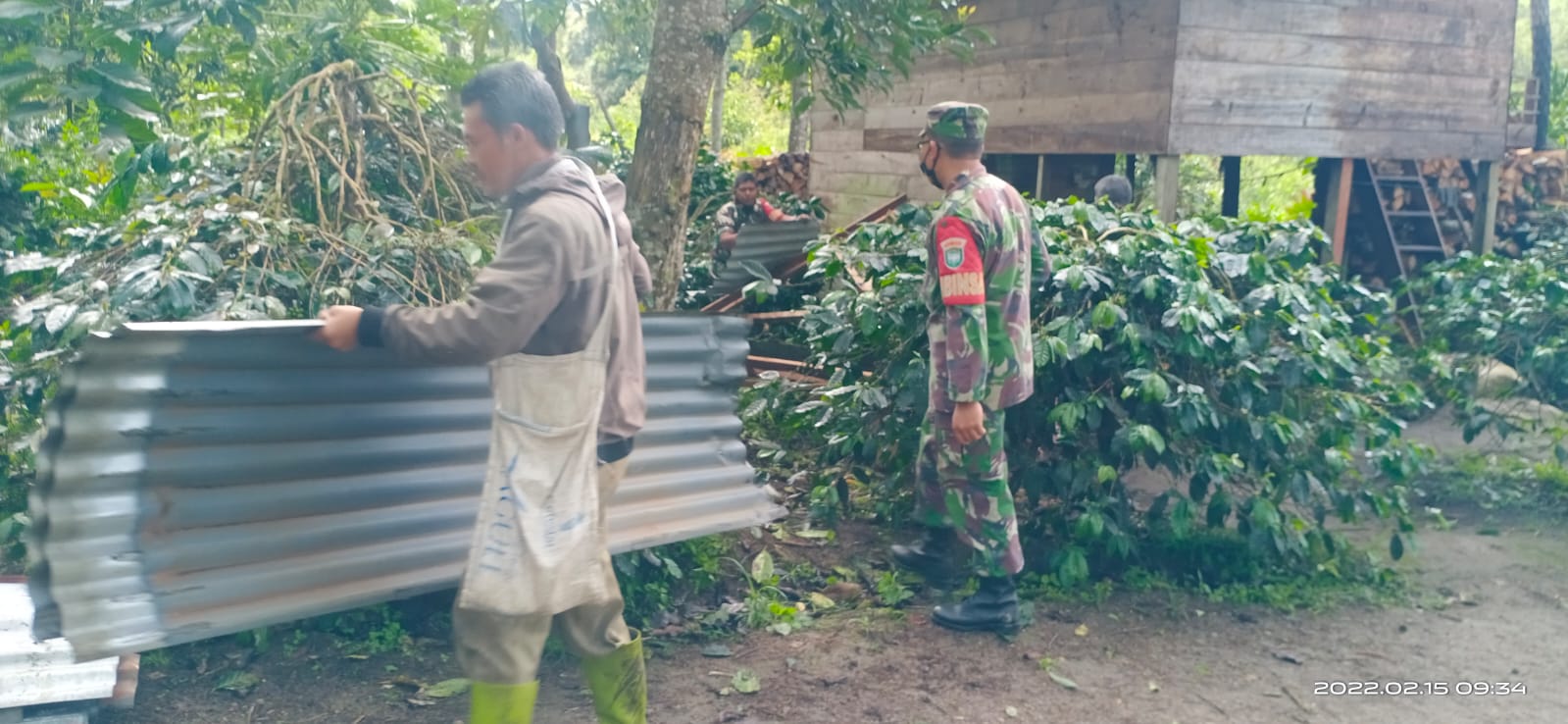 Keizalinnews.com|Redelong– Personel gabungan TNI Koramil 06/Bukit bersama warga melaksanakan gotong royong melanjutkan pembenahan rumah warga yang diterjang puting beliung. Selasa (15/02/2022).