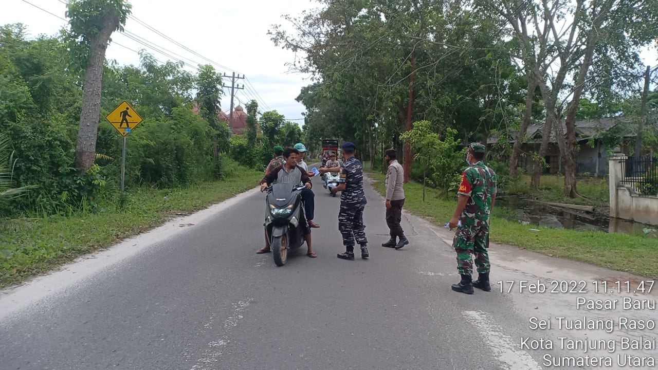 KeizalinNews.com Tanjung Balai — Babinpotmar Lanal TBA wilayah Sei Tualang Raso Serda Lumban Toruan bersama Babinsa dan Babinkamtibmas melaksanakan kegiatan Gakplin Protkes secara humanis terhadap masyarakat yang melintas dengan membagikan masker, bertempat di Jalan Sei Tualang Raso Kota Tanjungbalai, Sabtu (19/02/2022).