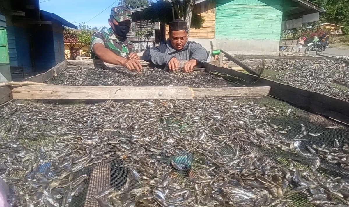 Keizalinnews.com|Takengon-Babinsa Koramil 04/Bintang Serda Arif fahmi melaksanakan komsos dengan masyarakat dan membantu menjemur ikan depik di desa Kejurun syah utama kec.Bintang kab.Aceh Tengah. Minggu (20/02/22).
