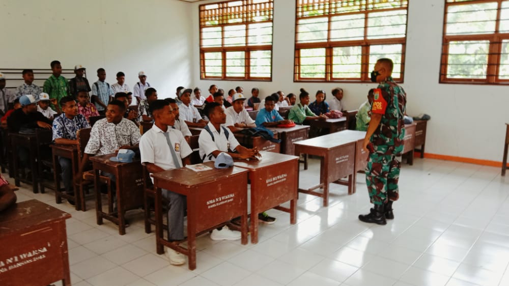 KeizalinNews.com Biak — Dan pos Ter Warsa Serma Ahmat Sakka bersama Babinsa Koramil 1708-02/Biak Utara memberikan materi wawasan kebangsaan, yaitu pengetahuan tentang Pancasila kepada para pelajar Sekolah Menengah Atas (SMA) Bertempat di SMA N 1 Warsa, Kampung Aman, Distrik Warsa, Kab. Biak numfor. Senin, (21/02/2022).