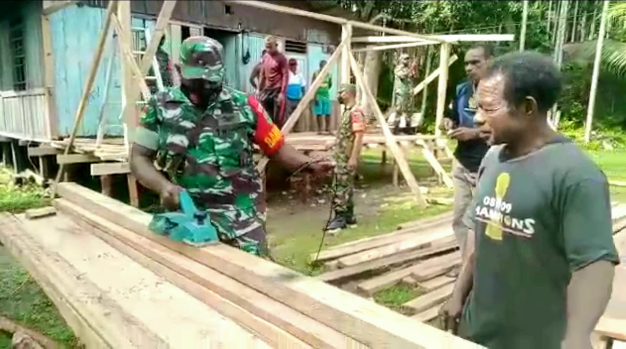 KeizalinNews.com Yapen — Selalu hadir ditengah-tengah masyarakat demi membantu segala kesulitan masyarakat yang ada diwilayah binaannya, para Babinsa Koramil 1709-01/Yapen Selatan Kodim 1709/Yawa, yang dipimpin oleh Serka David E. Waroi melakukan kegiatan Karya Bakti Pembangunan rumah salah satu warga yang berada di Kampung Roipi I Distrik Angkaisera Kab. Kepulauan Yapen, Senin (21/02/2022).